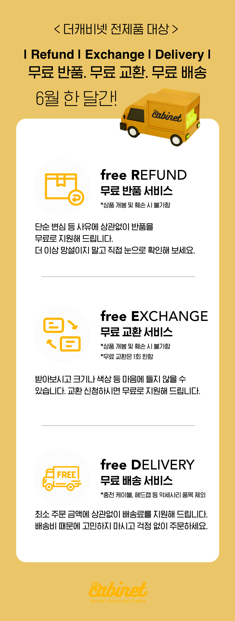 더캐비넷 6월 한 달간, 무료 반품 / 무료 교환 / 무료 배송 이벤트